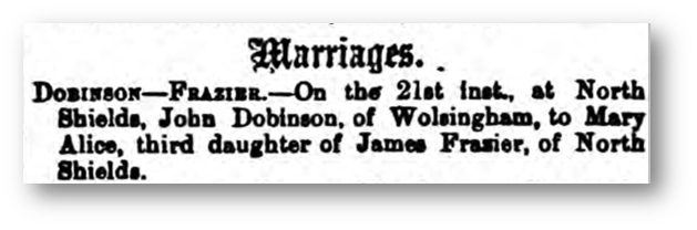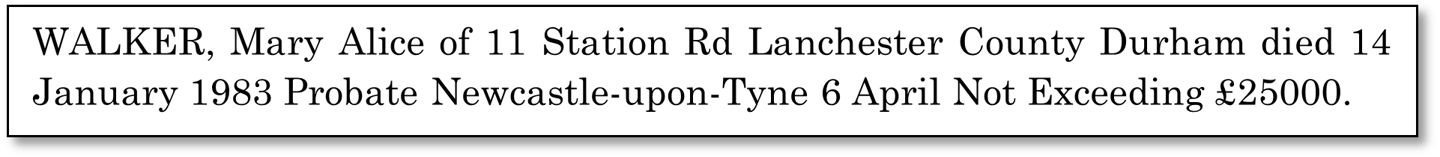 Mary Alice married Joseph Kirton Walker of Satley in 1922 and they set up home at Hollinside Lodge, Lanchester where husband Joseph was a Cartwright. She passed away in 1983 aged 85 years.