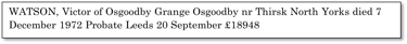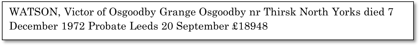 Victor Watson was born on May 15th 1897 and was the brother of pupils Frank and William Watson. The boys all lived at Redgate Farm, Wolsingham with their father John Walton, a Farmer and Auctioneer, and mother Ruth Kipling. Victor had four other siblings named John, Elizabeth, Harrison and Anthony. He married Margaret Isabella Wheatley from Tow Law in 1923 and farmed at Osgoodby Grange in Thirsk where they raised a son named Victor Kipling Watson.