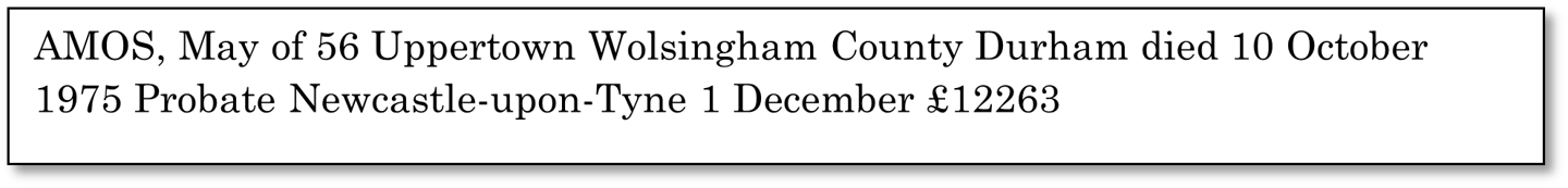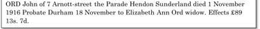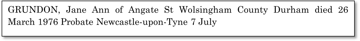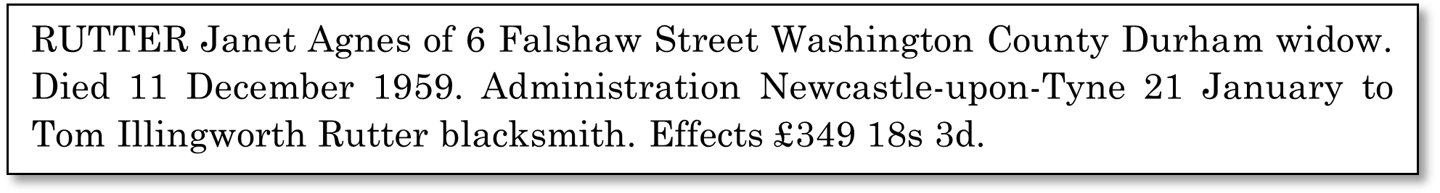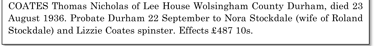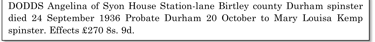 Born in Weardale on December 6th 1901, no further records are found for Arthur until the 1939 England and Wales Register where he was found living at the home of Jane Ann Coates (nee Angus) in Melbourne Place, Wolsingham. Unverified research suggests Arthur Angus passed away in 1966 aged 64 years.