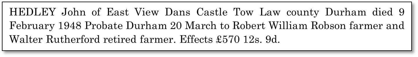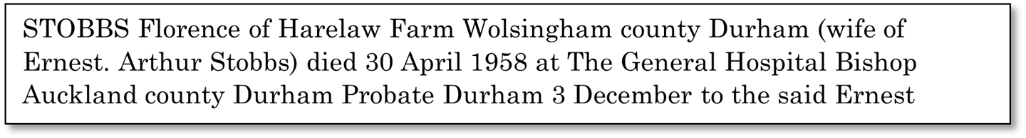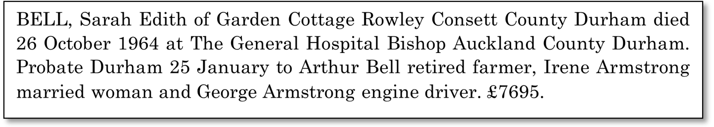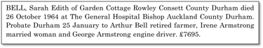 Mary’s sister Sarah Edith was born in February 1900. She married Arthur Bell in 1924 and lived at West Shields Farm, Satley where Arthur was a Working Farmer. They had a daughter named Irene. She passed away in October 1964 aged 64 years.