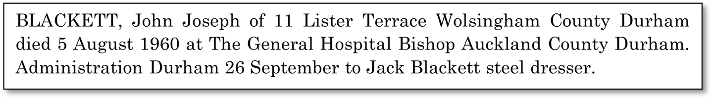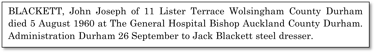 John Blackett was born on March 10th 1890 and lived in the Causeway, Wolsingham with his father Alfred, a File Cutter, his mother Isabella, and his brother Hugh. His father passed away on December 20th 1892, and his mother remarried in 1895. John then lived at 6 Attwood Terrace with his step-father John Ambler, a Fireman at the Steelworks Boilers. On leaving school, John found employment as a Steel Dresser at the Steelworks.