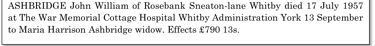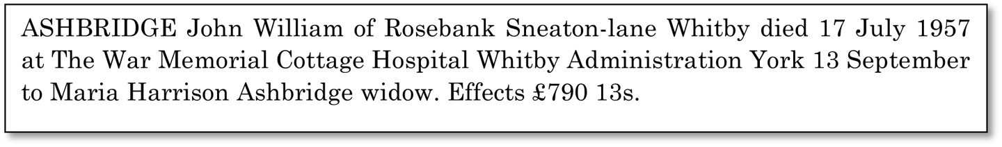 The family moved to Whitby where they farmed at Manor House Farm in Sneaton. John worked on the family farm before marrying Maria Harrison Peacock in 1913. They set up home in Sneaton Lane, Whitby where John was employed as a Motor Lorry Driver. He passed away in 1957 aged 64 years.