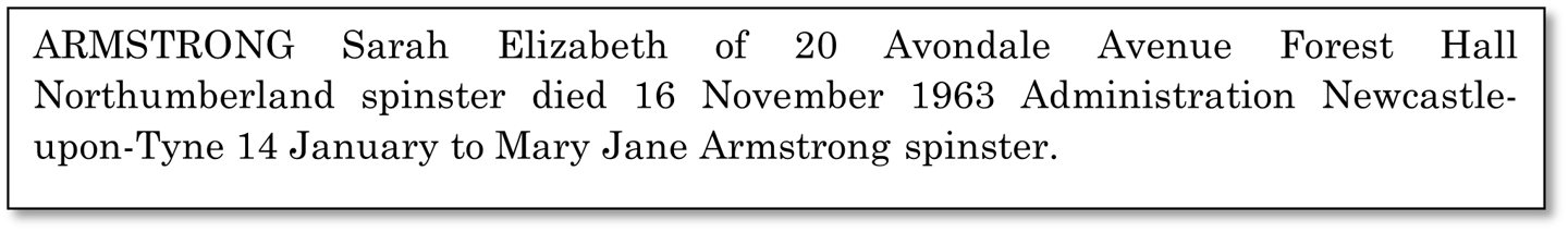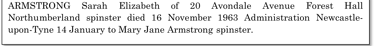 Sarah Elizabeth Armstrong passed away on 19th November 1963 aged 70 years. She is buried in Benton Cemetery, Newcastle upon Tyne alongside er parents and sister.