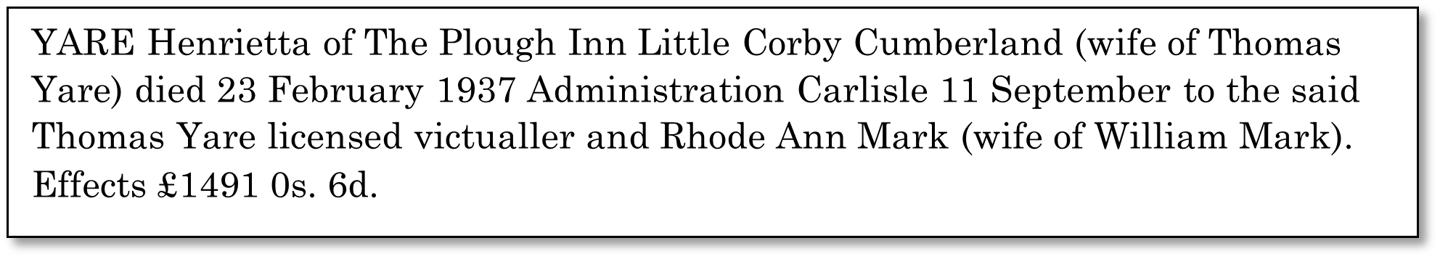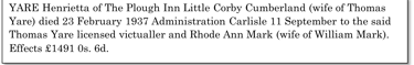 Monica’s mother Henrietta passed away on February 23rd 1937. Her mother’s will reveals the family have moved to Cumberland where her father Thomas is running The Plough Inn in Little Corby.