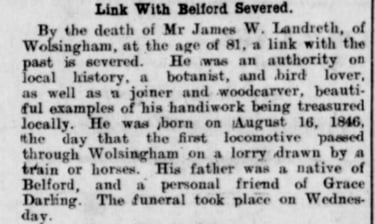 James Wilkinson was born on April 4th 1868 in Gainford, and as a young child lived with his Grandfather John Pentland, a Chain Maker, in East End, Wolsingham. Whilst he attended school, James lived at the home of his Uncle John Pentland and Aunt Phebe in Meadhope Street, Wolsingham, before moving with them to 10 Durham Road Cottages, where James had secured employment as a Steel Slotter at the Steelworks.
