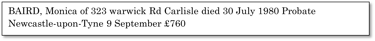 In 1941, Monica married Thomas Baird in Cumberland. She passed away on July 30th 1980 aged 72 years.