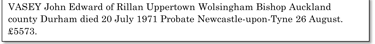 John was born on May 26th 1897 to Steel Dresser William Vasey and his wife Isabella. He lived with his parents and younger brother William in Meadhope Street, Wolsingham. On leaving school, John found work at the Steelworks as a Steel Moulder.