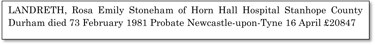 On January 29th 1917 Elizabeth married Roger Storey, a farmer of High Hall Farm, Coxhoe. She passed away in 1935 aged 60 years.