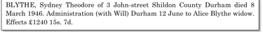 Sydney Blythe was born on December 31st 1882 to Steam Engine Fitter John and his wife Margaret, living in Angate Street, Wolsingham. Sydney had two younger brothers named John and Edward, as well as three younger sisters named Hildreth, Margaret, and Jenny.