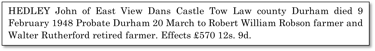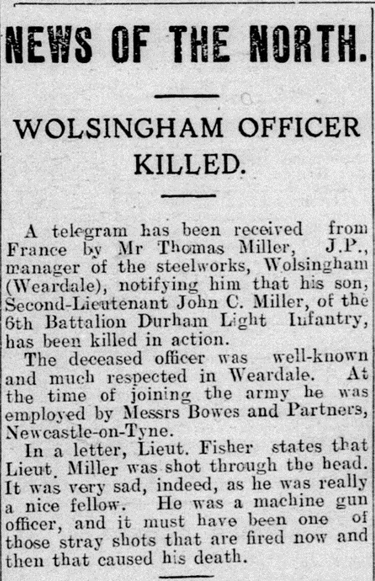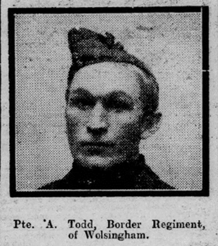 Violet married Coal Miner Matthew Hodgson from Tow Law On September 17th 1910, and they continued to live with Violet’s aunt and uncle in West End, Wolsingham raising their son John William. Her husband Matthew was killed in action on October 9th 1918 aged 31 years whilst serving in France with the 13th Battalion (B Company) of the Durham Light Infantry. He is buried in Beaurevoir British Cemetery and commemorated on the Wolsingham War Memorial.