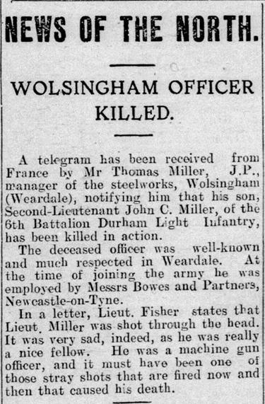 John Wilkinson lived in East End, Wolsingham with his parents Robert, a Steel Turner & Fitter, and Sarah (nee Lydiate). He had two sisters named Isabella, and Sarah, and a brother named Robert. His sister Sarah passed away in infancy aged 16 months.