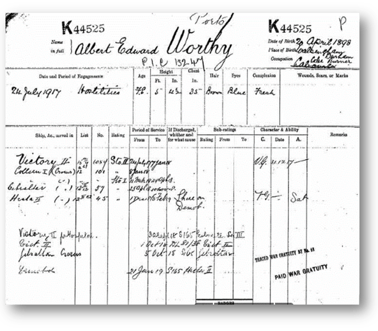 After leaving school, Albert started work as a Coke Burner. He joined the Royal Navy in 1917 although his service records suggest his role was mainly land-based. A Naval Rating generally begins and ends his time on 'HMS Victory' which is effectively 'in transit' and this covers his initial training and discharge establishments. Albert’s pre-war occupation as a Coke Burner would make him a good fit as a Stoker: a rating in the Marine Engineering branch which was responsible for looking after the coal fired steam engines. His records show duty on HMS Colleen which was another shore-based establishment at Queenstown in Ireland, HMS Gibraltar, a depot ship based in the Shetland Islands, and HMS Hecla II, an armed patrol trawler based at Buncrana, Ireland.